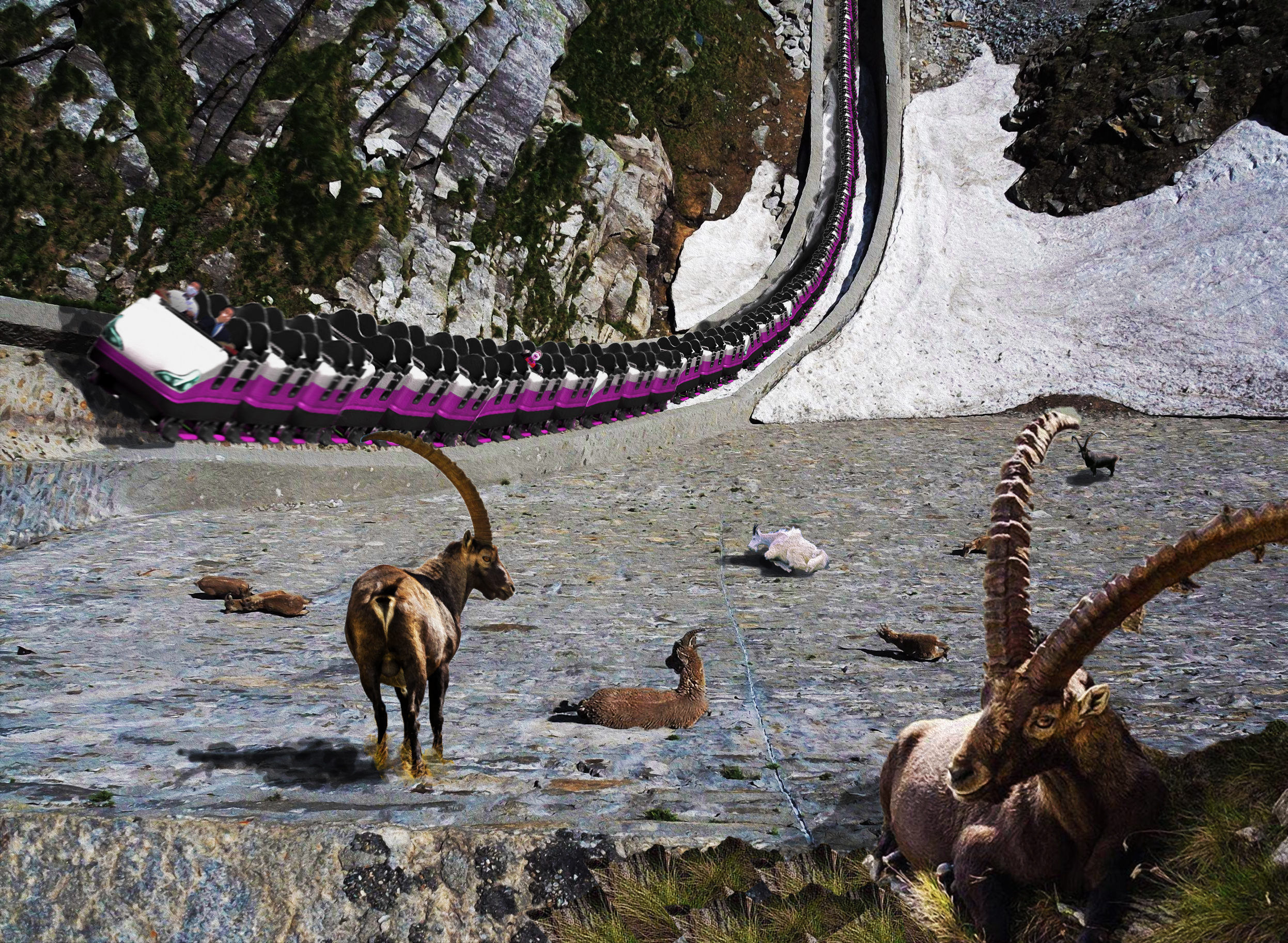 Collage B: A combination of an actual top-down image of salt-licking ibex scaling a dam with superimposed ibex standing on it as if it's a flat surface. Oh, and some covid-safe theme-parking.